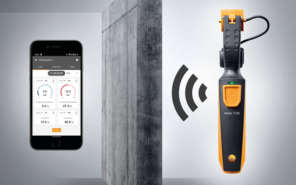 testo 115i 智能無線迷你管鉗式溫度測量儀,可用于空調和制冷系統進行維修保養、故障排除以及安裝測試。還可以用于測量回流溫度。
