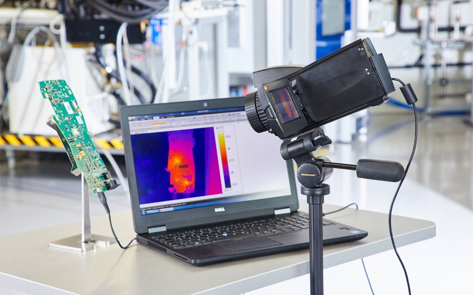在研究和開發領域,熱成像儀也用于溫度分布的目標分析,例如:在電路板上的散熱設計。電路板上的電子元件越來越小,從而增加了散熱方面的挑戰。只有具有非常高像素的高性能熱像儀才能勝任此任務。如果需要分析在一定時間內的捕捉時間的溫升或者冷卻,用于進一步優化設計,可以借助Testo熱像儀的PTA過程趨勢分析功能進行測量。
