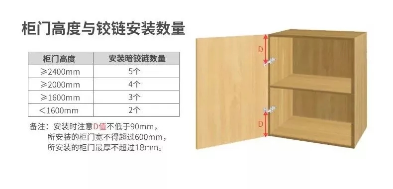確定了選購哪種類型的鉸鏈,第二步便是數(shù)量問題啦!適中的鉸鏈數(shù)量可以延長柜門的使用壽命和使用的流暢性,參照下表標準,讓你不多買也不買漏。